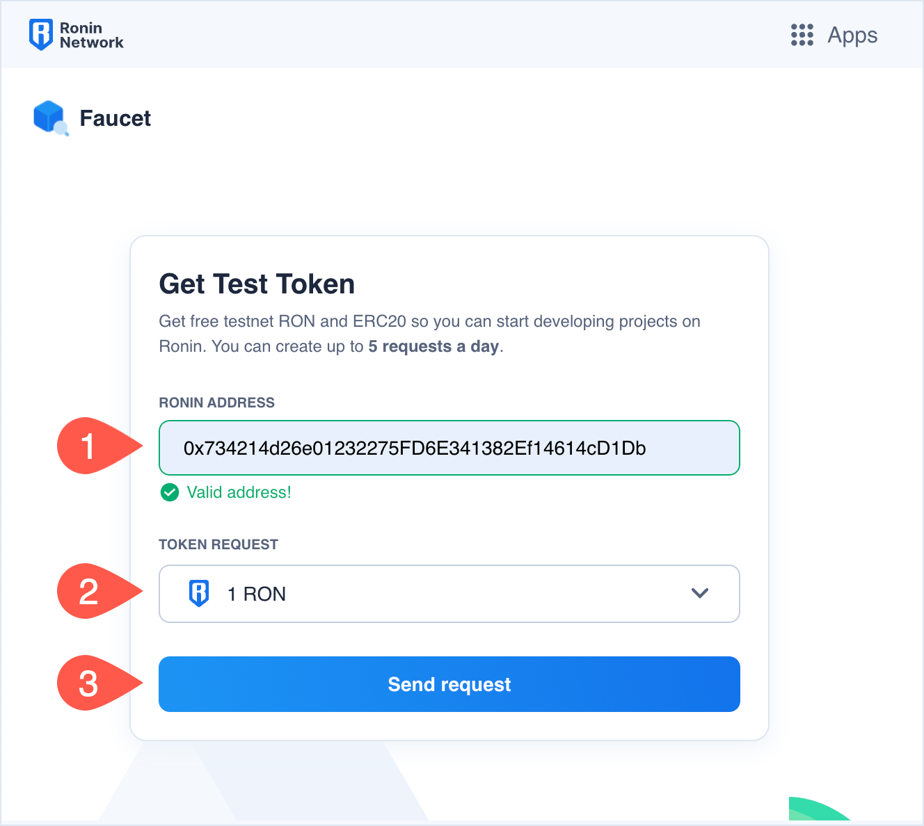 To request testnet RON tokens from the Ronin Faucet, follow these steps: