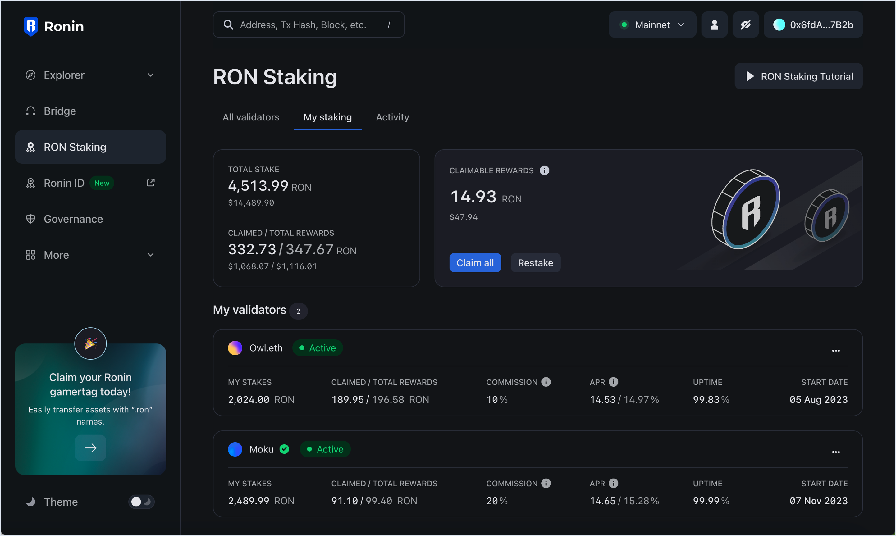 To view your staking activities, visit the RON staking page and select the My staking tab. This shows you how much RON you staked and with which validators. This is also where you can also claim and restake your staking rewards.