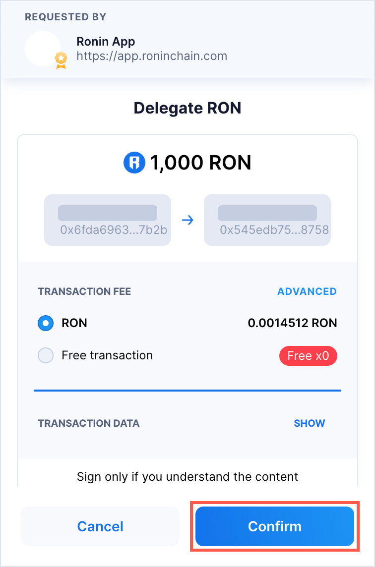 Confirm the transaction in your Ronin Wallet.
