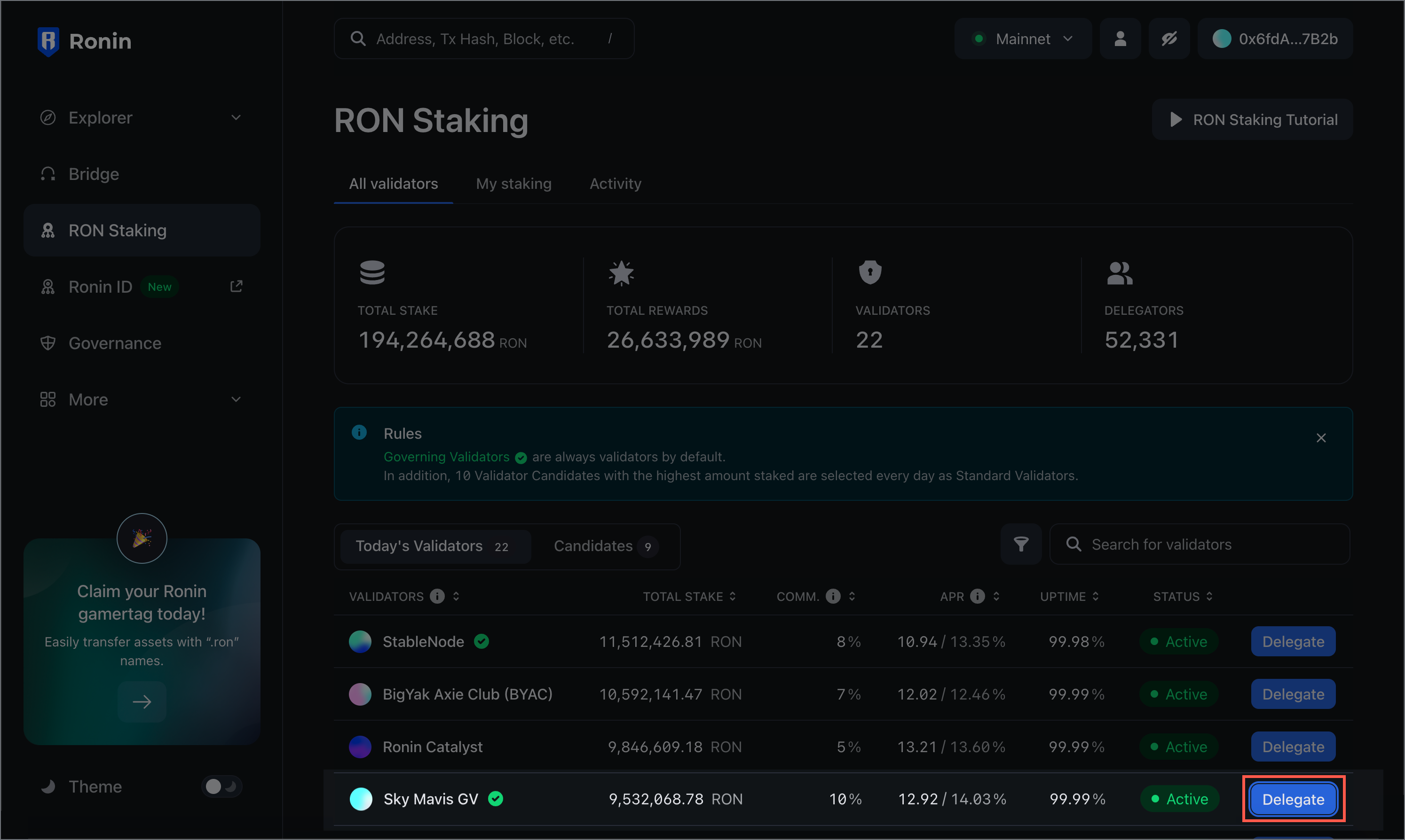 On the All validators tab, choose a validator to stake your RON with, and then select Delegate.