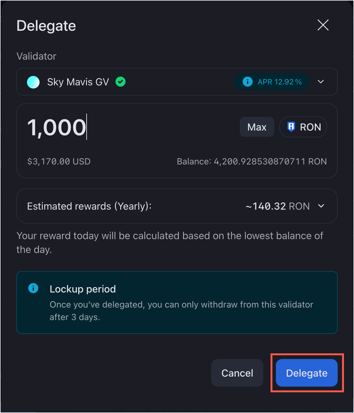 Enter the amount of RON to stake, then click Delegate.