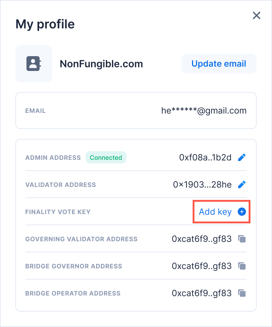 This guide demonstrates how to add a finality vote key to your profile. The finality vote key is used to vote for blocks in the fast finality mechanism. If you're an active Ronin validator, you need to have this key added to have the fast finality rewards transferred to your admin address by the end of the day.