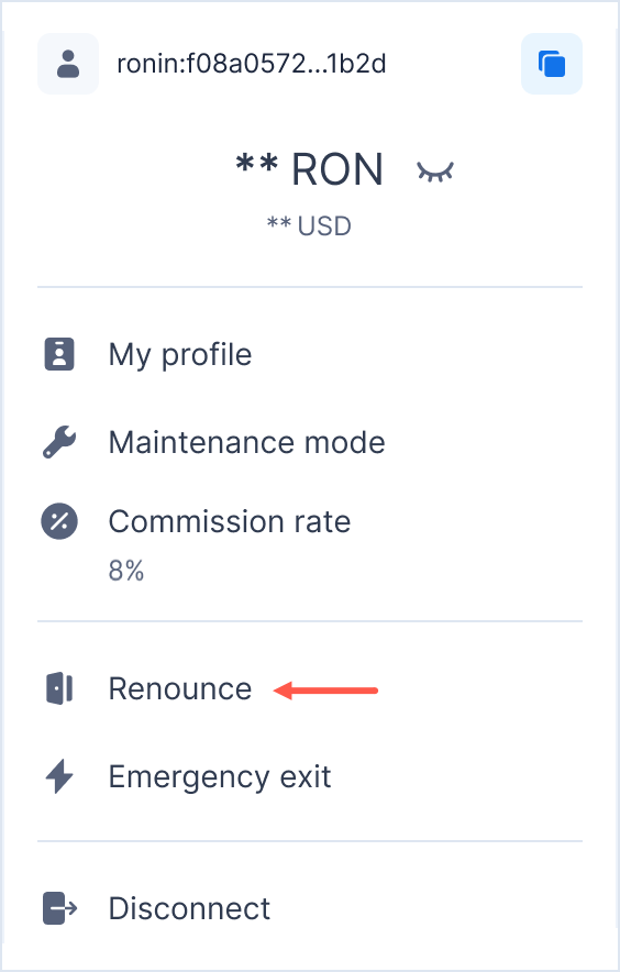 If you're a Standard Validator or Validator Candidate, follow this guide to renounce your validator role. Governing Validators should reach out to Sky Mavis for further steps.