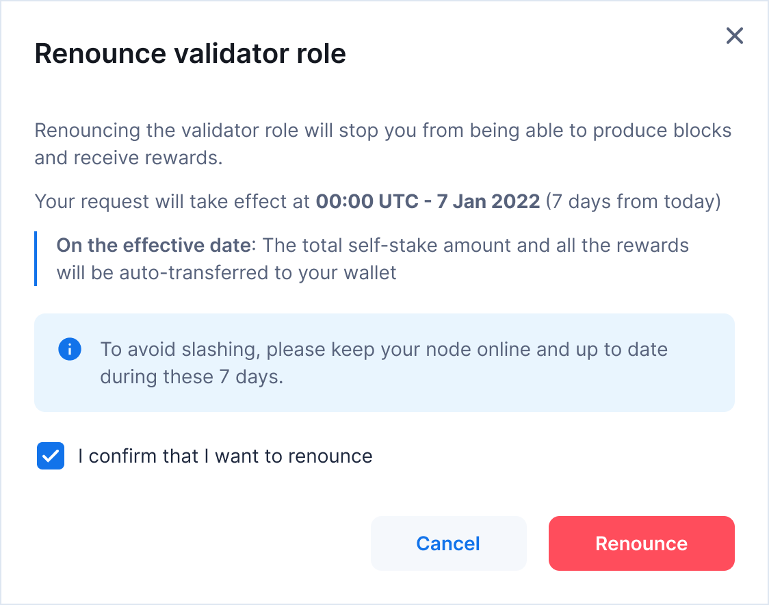 After submitting the request, wait seven days for the renunciation to take effect. To avoid slashing, keep your node online and up to date during this period. Your commission, fast finality rewards, staking rewards, and the remaining self-stake will be transferred to you on the date of renunciation.