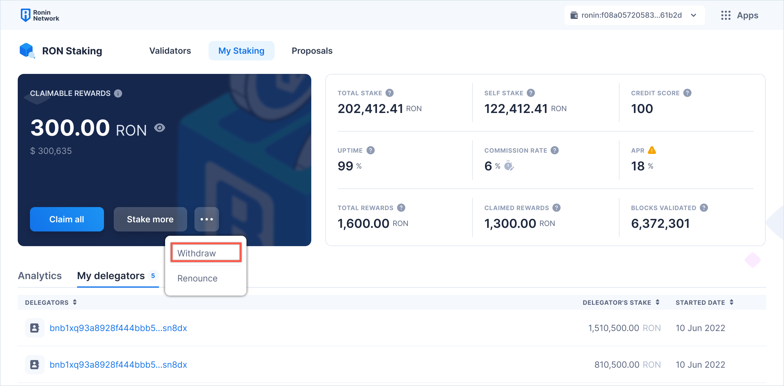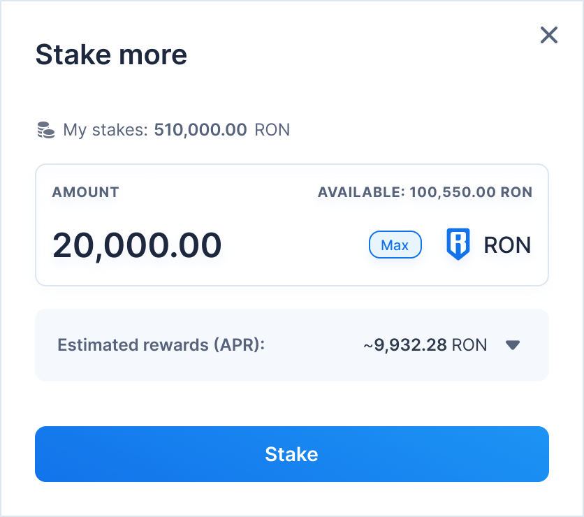 Enter the amount manually or choose Max to stake all available RON, and then select Stake. The estimated reward is calculated based on your estimated APR (annual percentage rate), so you can see how much RON returns from this stake.